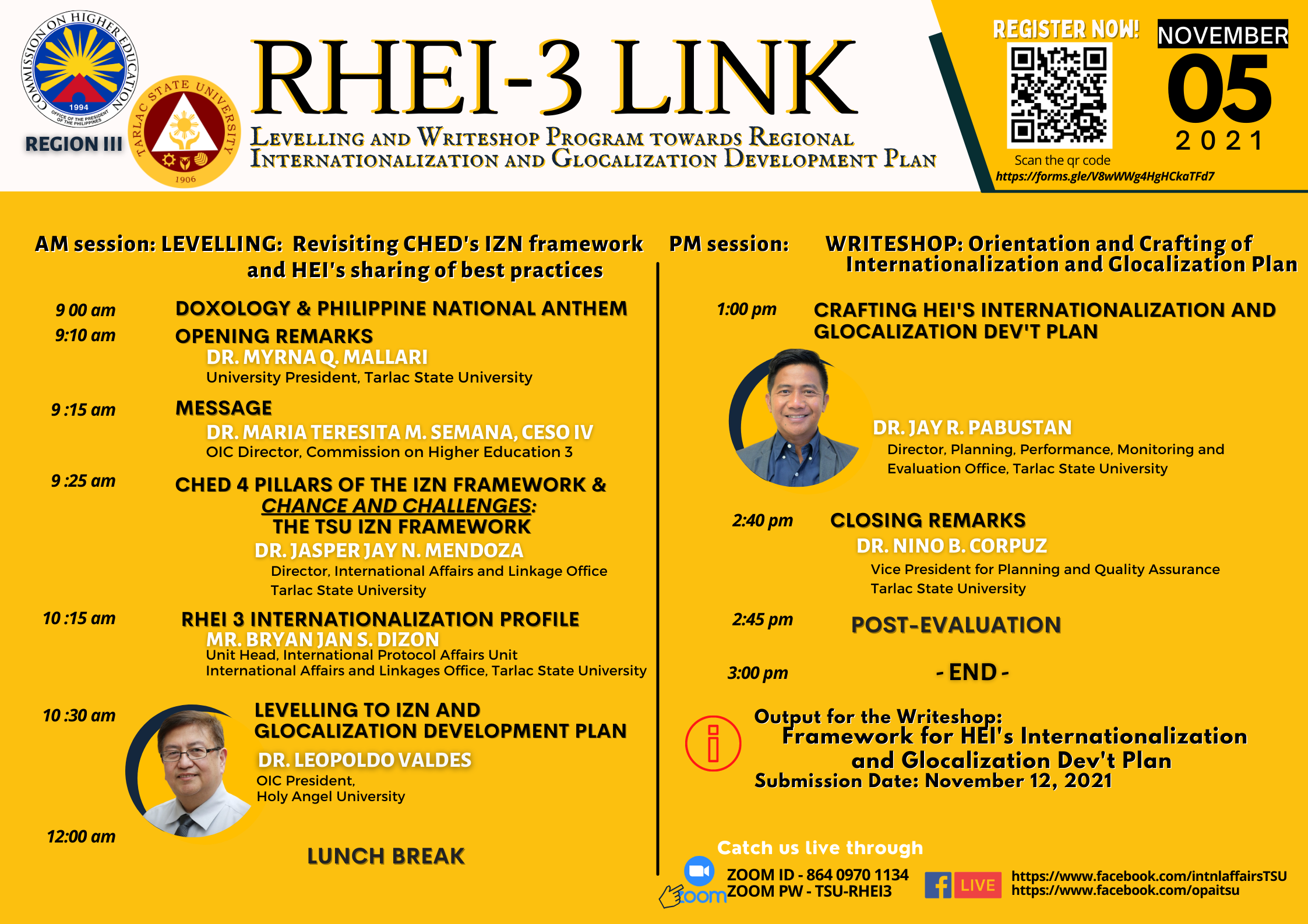 Tarlac State University and the Commission on Higher Education Region III are inviting all higher education institutions (HEIs) in Region III to attend the virtual write-shop titled: