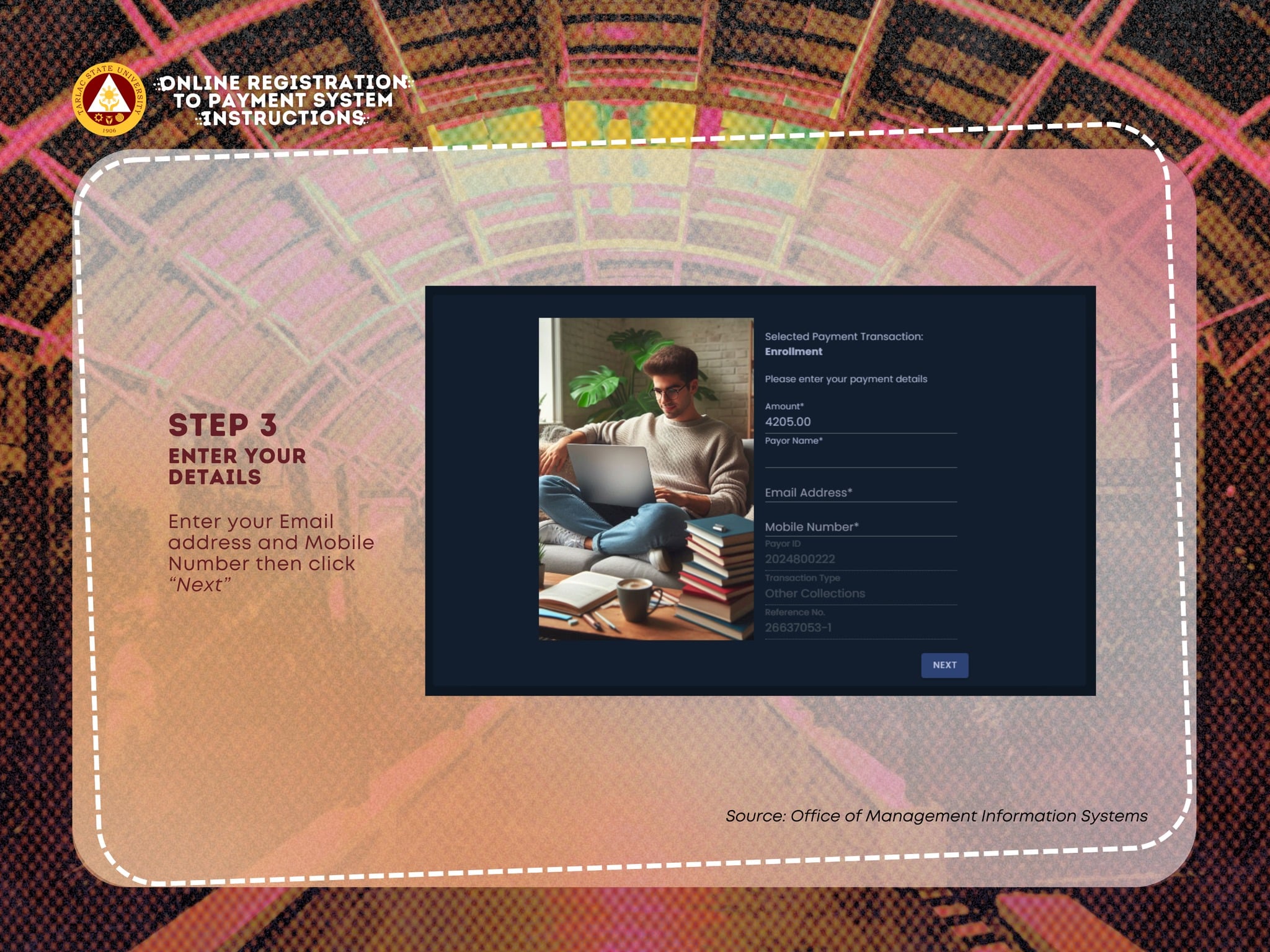 See this post for the steps: https://www.facebook.com/TarlacStateU/posts/pfbid037aC9QLntsVc2iMBZyiKmiqeZDY9biB4mvcru17YoGZf6DB9r7zWumKKWR5owrpoyl
