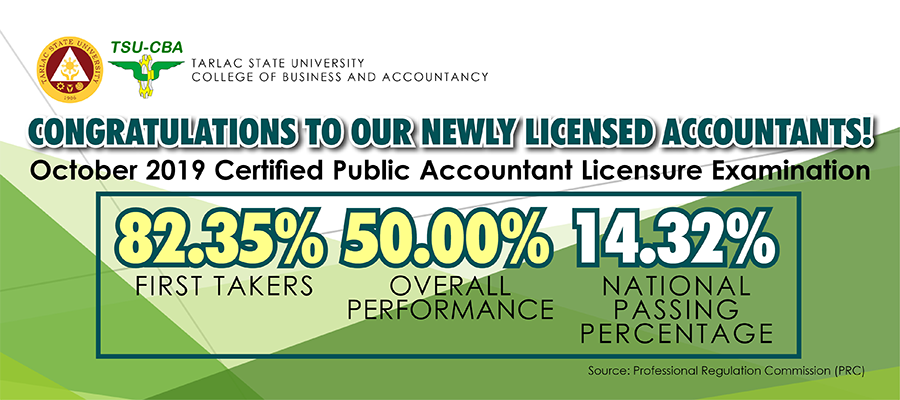 Tarlac State University garners 82.35% for its first timers in the October 2019 Certified Public Accountant Licensure Exam (CPALE) posted by the Professional Regulation Commission (PRC) on October 21, 2019 via their website.