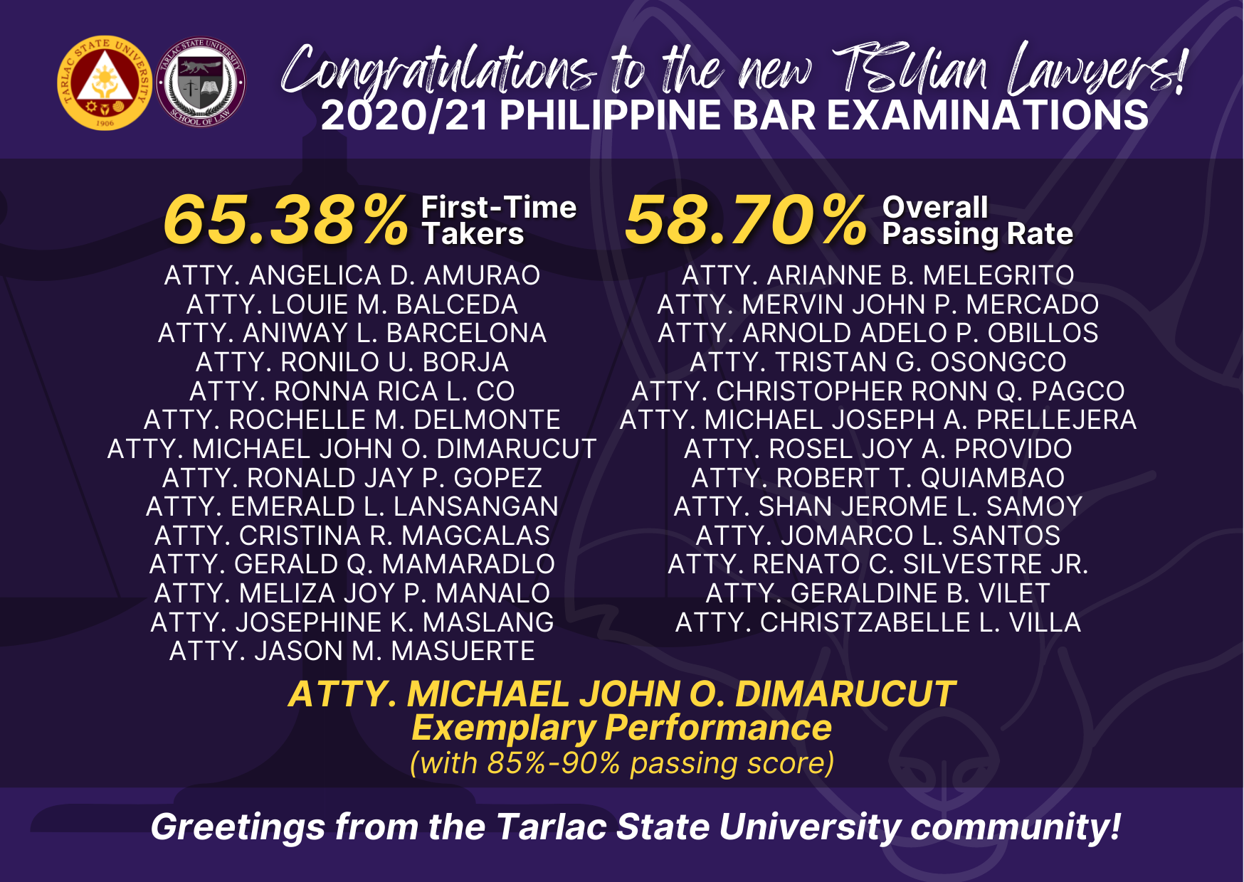 Tarlac State University School of Law garnered a 65.38% passing percentage for first time takers and an overall passing rate of 58.70% with a total of 27 new TSUian lawyers in the 2020/21 Bar Examinations.