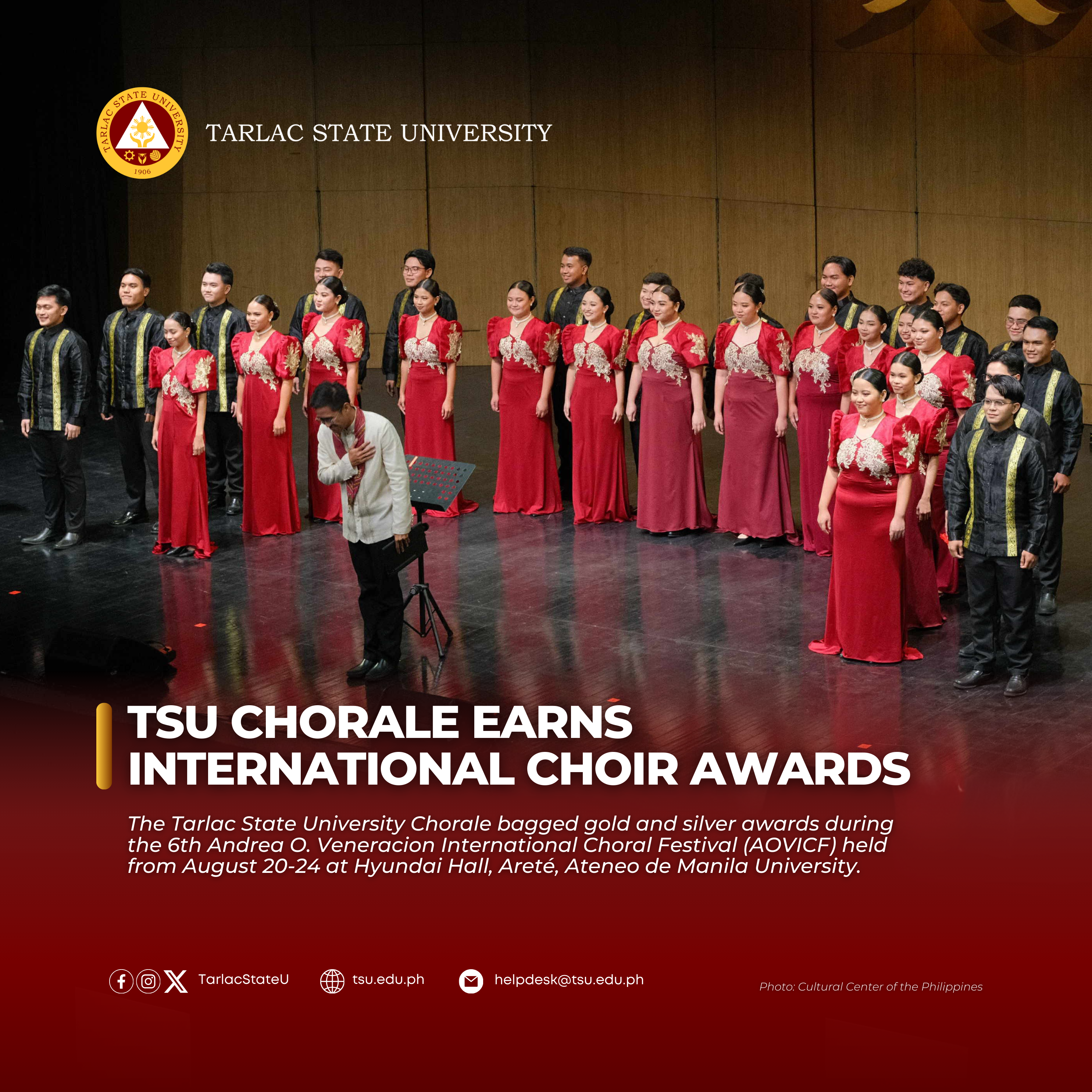 The Tarlac State University Chorale bagged gold and silver awards during the 6th Andrea O. Veneracion International Choral Festival (AOVICF) held from August 20-24 at Hyundai Hall, Areté, Ateneo de Manila University.