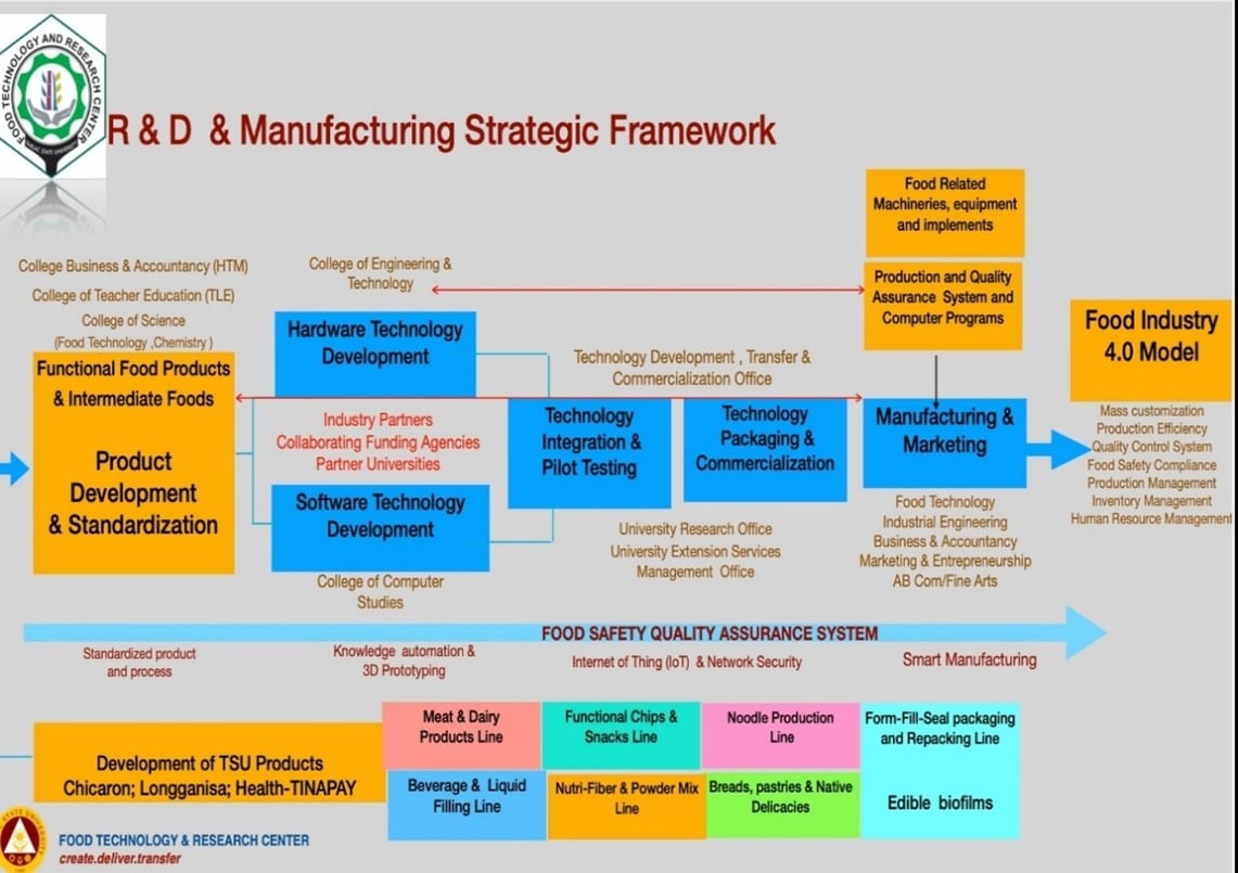 The figure below presents the R and D and Manufacturing framework envisioned for the TSU-FTRC in the next five-ten years.  It aims to establish seven (7) different production modules which will include Meat & Dairy Product Line; Functional Chips and Snacks Line; Vege-based Noodle Lines; Nutri- Powder and Fiber Mix Line; Breads, pastries and native delicacies; Beverage and Liquid Filling Line and Form-Fill-SealPackaging/Repacking Line.